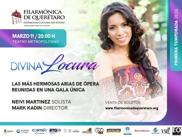 Con el espectáculo titulado “Divina Locura”, el próximo 11 de marzo, a las 20:00 horas, en el Teatro Metropolitano, la Orquesta Filármonica del Estado de Querétaro (OFEQ) concluirá su primera temporada de conciertos 2026, en donde las y los asistentes podrán dejarse llevar por ópera, la voz lírica y una gran tradición musical europea.