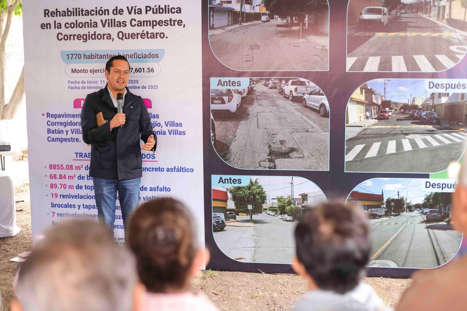 Por su parte, la titular de la Secretaría de Obras Públicas, Viridiana Nava, detalló que los trabajos realizados fueron en las calles Villas Corregidora, Villas Prado, Villas Bajío, Villas Batán y Villas Los Nogales, donde se llevó a cabo la pavimentación con concreto asfáltico, la construcción de banquetas, la instalación de topes vehiculares de asfalto, así como 19 renivelaciones de pozos de visita con brocales y tapas nuevas, y 7 renivelaciones con brocales y tapas de recuperación.