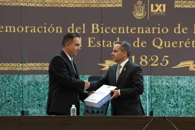 En Sesión Solemne de Pleno de la LXI Legislatura, el secretario de Gobierno, Eric Gudiño Torres, en representación del gobernador, Mauricio Kuri González, entregó al presidente de la Mesa Directiva, diputado Gerardo Ángeles Herrera, el informe escrito 2024-2025 del Poder Ejecutivo del Estado, correspondiente al cuarto año de ejercicio constitucional con fundamento en el Artículo 22 Fracción X de la Constitución Política local.