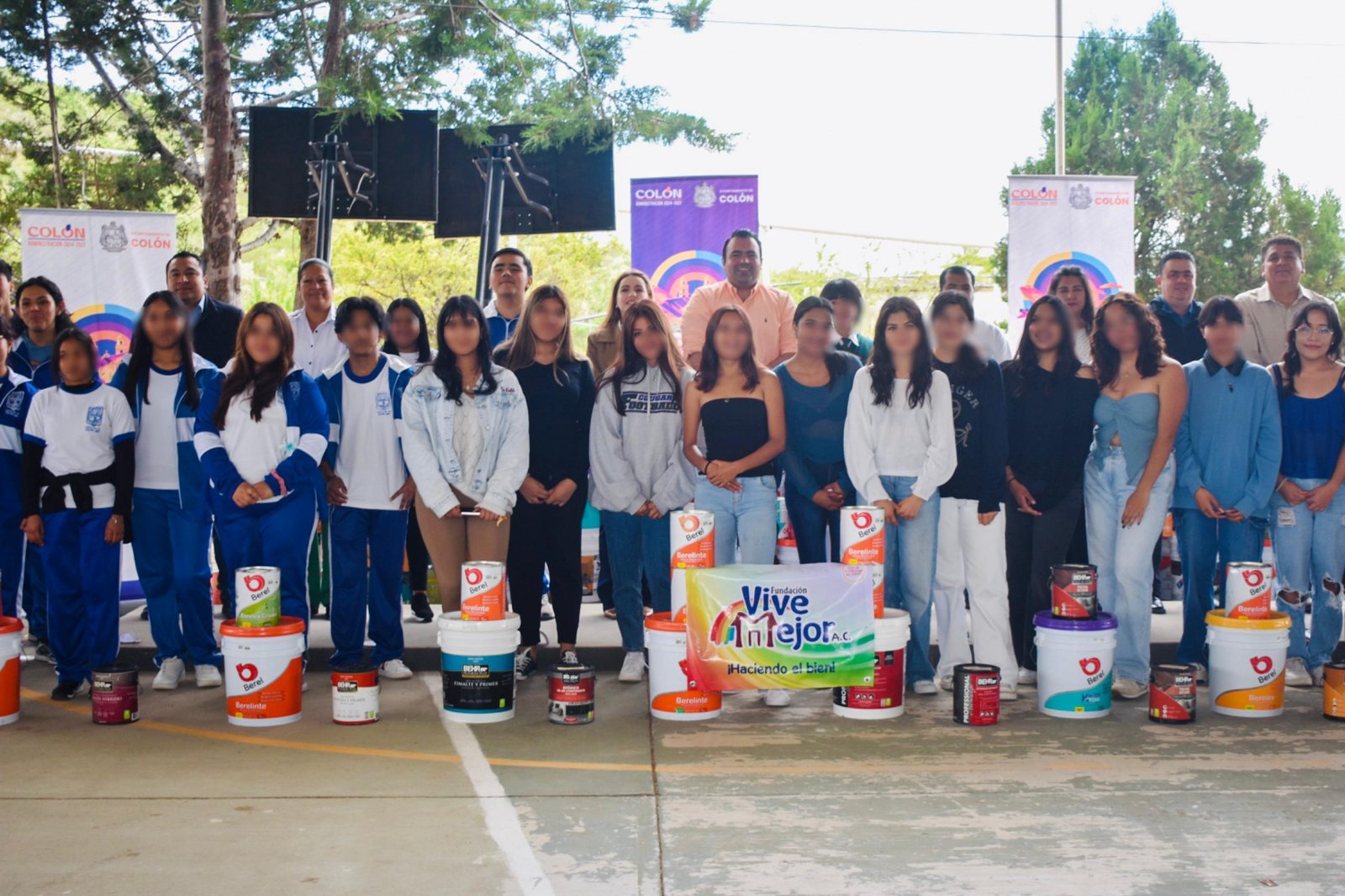 El Presidente Municipal, Gaspar Trueba Moncada, y la Fundación “Vive Mejor” entregaron 3,500 litros de pintura a 34 escuelas de 26 comunidades de Colón, con el objetivo de embellecer las instalaciones y mejorar el entorno de los planteles donde estudian más de 4,300 alumnos.