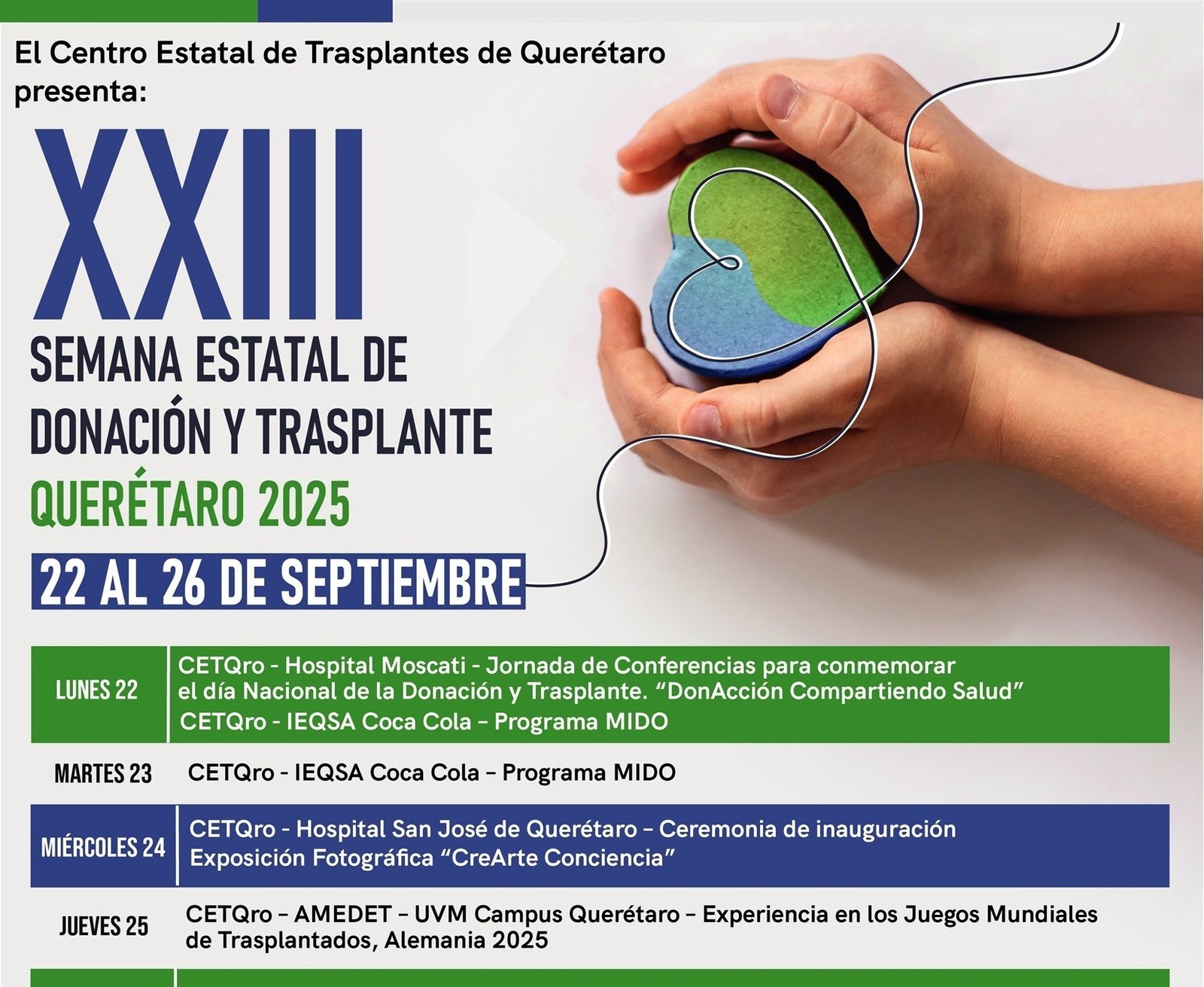 La Secretaría de Salud (SESA) del estado de Querétaro, a través del Centro Estatal de Trasplantes Querétaro, invita a la ciudadanía a ser parte de la XXIII Semana Estatal de Donación y Trasplante, que se llevará a cabo del 22 al 26 de septiembre, con el propósito de fortalecer la cultura de la donación de órganos y tejidos.