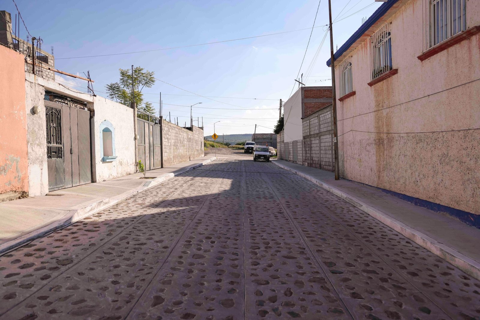 La titular de la Secretaría de Obras Públicas del Municipio de Corregidora, Viridiana Nava, detalló que el proyecto integró la sustitución de empedrado empacado en tepetate por empedrado empacado en mortero con recuperación de la piedra y construcción de banquetas y guarniciones, además del suministro del drenaje sanitario.