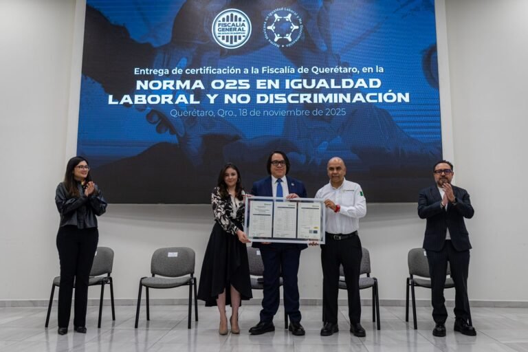 La Fiscalía General del Estado de Querétaro recibió la certificación en la Norma Mexicana NMX-R-025 en Igualdad Laboral y No Discriminación, que acredita la implementación de prácticas de igualdad, accesibilidad y prevención de la violencia laboral en las 28 unidades que integran la Institución.