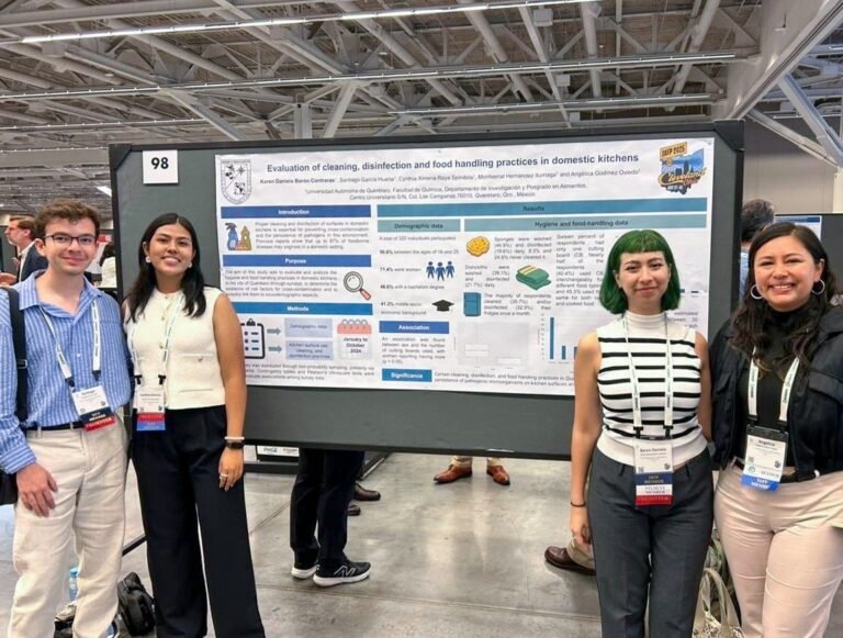 De la Ingeniería en Biotecnología, Santiago García Huerta, Cynthia Ximena Raya Spíndola y Karen Daniela Barón Contreras —con la guía de la Dra. Angélica Godínez Oviedo— abordaron temas como los hábitos de consumo y preparación de cocinas domésticas, evaluación de microorganismos indicadores y patógenos en superficies comunes como trapos, tablas de picar y esponjas; así como transferencia de Salmonella desde esponjas a superficies plásticas en condiciones simuladas de lavado.