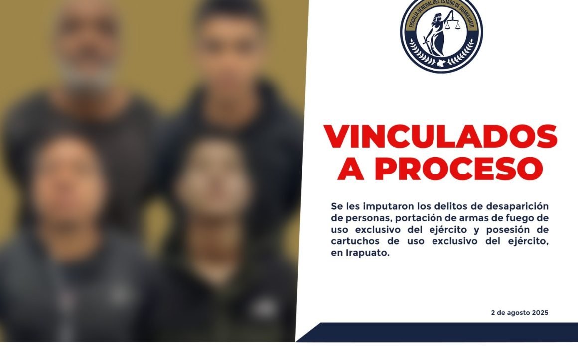 La Fiscalía General del Estado de Guanajuato logró la vinculación a proceso de cuatro hombres que fueron detenidos con armamento de uso exclusivo del Ejército y bolsas con restos humanos.
