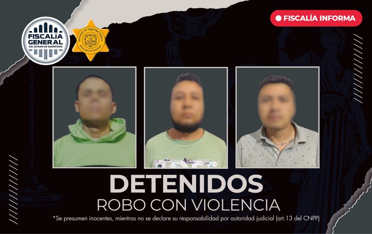 La Fiscalía de Querétaro informa que fueron detenidos “yoyo”, “oso” y “güero” por su probable intervención en el delito de Robo de Vehículo con Violencia, cometido el pasado 22 de noviembre.