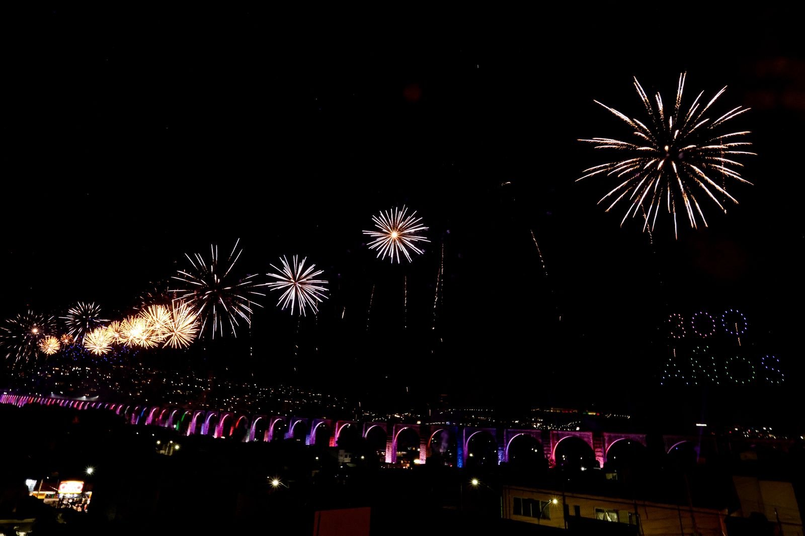 Al caer la tarde, el cielo se tiñó de tonos cálidos que dialogaban con la piedra rosada. Algunos se sentaron en las banquetas, otros buscaron la mejor vista. Entonces, la tecnología y la tradición se dieron la mano: un espectáculo de drones dibujó figuras en el aire, recreando la silueta del acueducto y otros símbolos de la ciudad, mientras los juegos pirotécnicos estallaban en sincronía, pintando la noche de colores y arrancando aplausos y asombro colectivo.