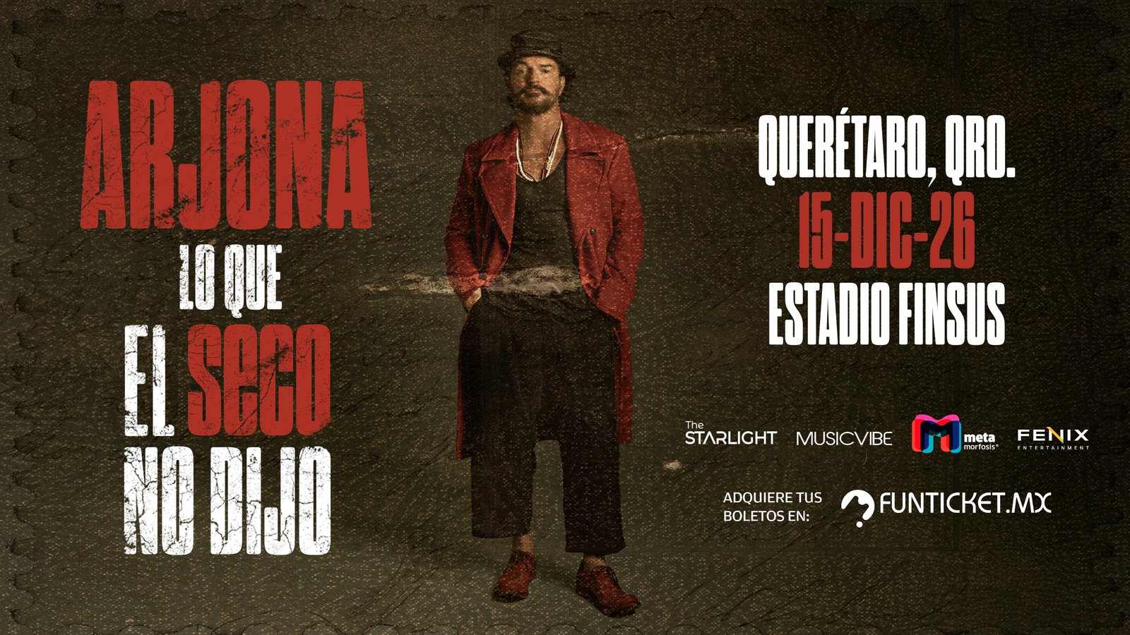 Será el próximo 15 de diciembre cuando Querétaro reciba a Ricardo Arjona con su nueva gira “Lo que el Seco no dijo” en el Estadio Finsus. Los boletos se pueden adquirir a través del sistema funticket y van desde los mil 240 pesos, en la zona General de pie B, hasta 8 mil 790, en la zona Diamante. El concierto tiene una programada de inicio a las 21:00 horas con apertura de puertas a las 19:00 horas.